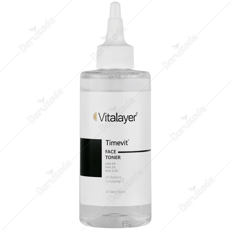 تونر تایم ویت ویتالیر با بهره مندی از برخی آلفا هیدروکسی اسید ها (AHA)، بتا هیدروکسی اسید ها (BHA) و پلی هیدروکسی اسید ها (PHA) به صورت ملایم پوست را لایه برداری نموده و در اصلاح و یکنواخت شدن رنگ پوست موثر است.