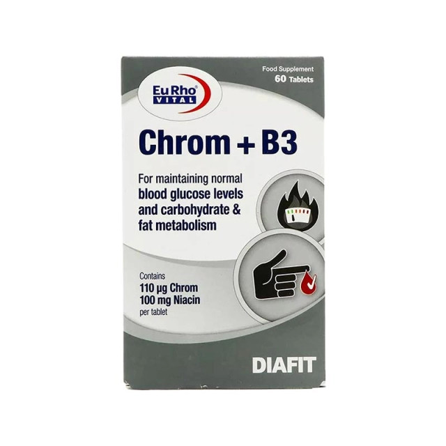 کروم ب۳ یوروویتال با110 میکروگرم کروم و 100 میلی گرم نیاسین در هر قرص، برای بهبود متابولیسم درشت مغذیها و حفظ سطح قند خون در محدوده نرمال کاربرد دارد. قرص کروم B3 از طریق تقویت عملکرد انسولین و افزایش حساسیت به انسولین در بافتها، به روند درمان افراد دیابتی و افراد مبتلا به سندروم تخمدان پلی کیستیک (PCOS) کمک مینماید.